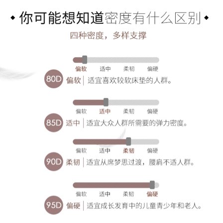 其实最主要乳胶床垫是分这边有80D、85D、90D、95D的;